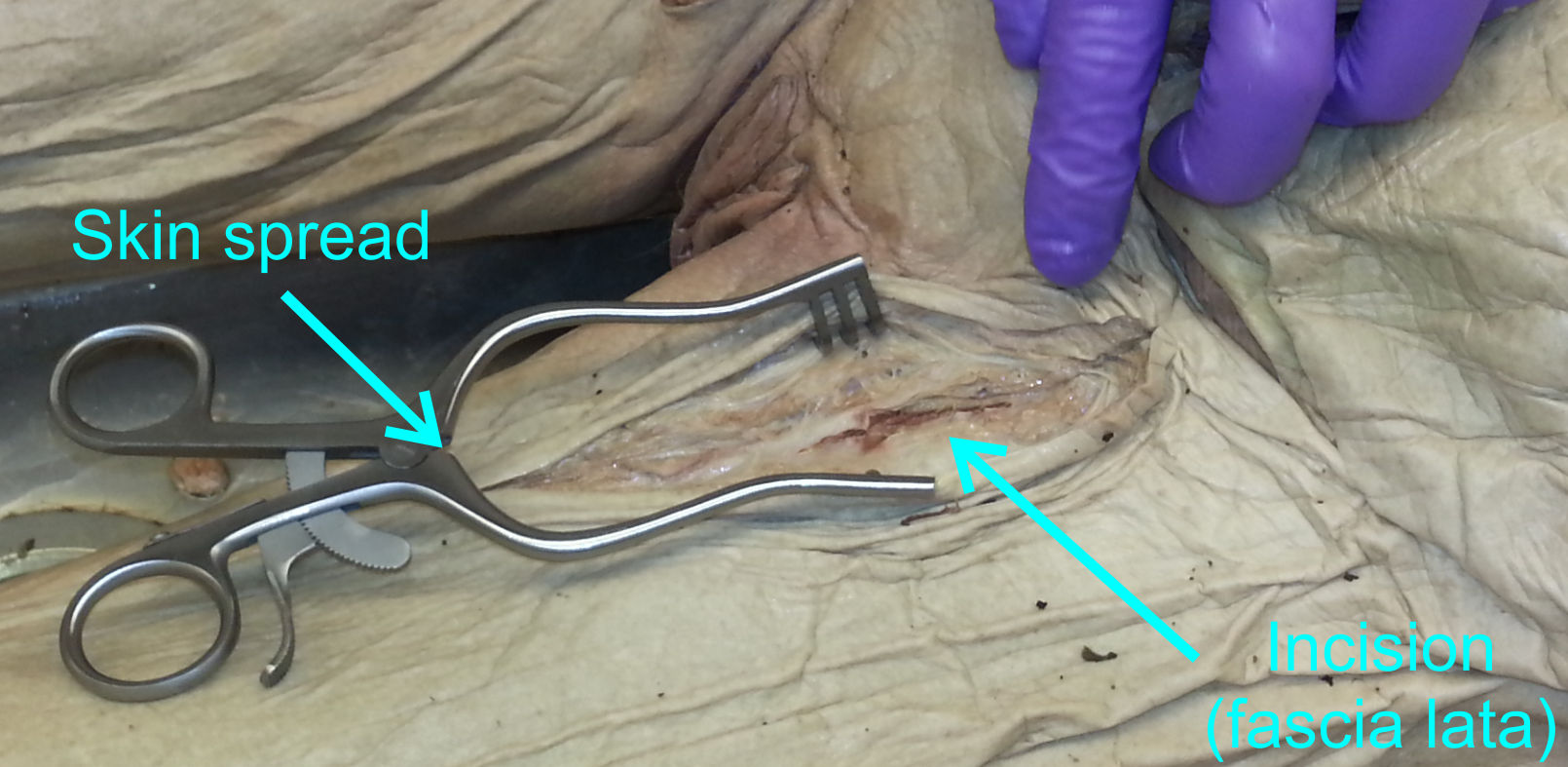 3) Force your finger into the subcutaneous tissue and vigorously spread that tissue laterally and medially deepening the opening to the level of the fascia lata.