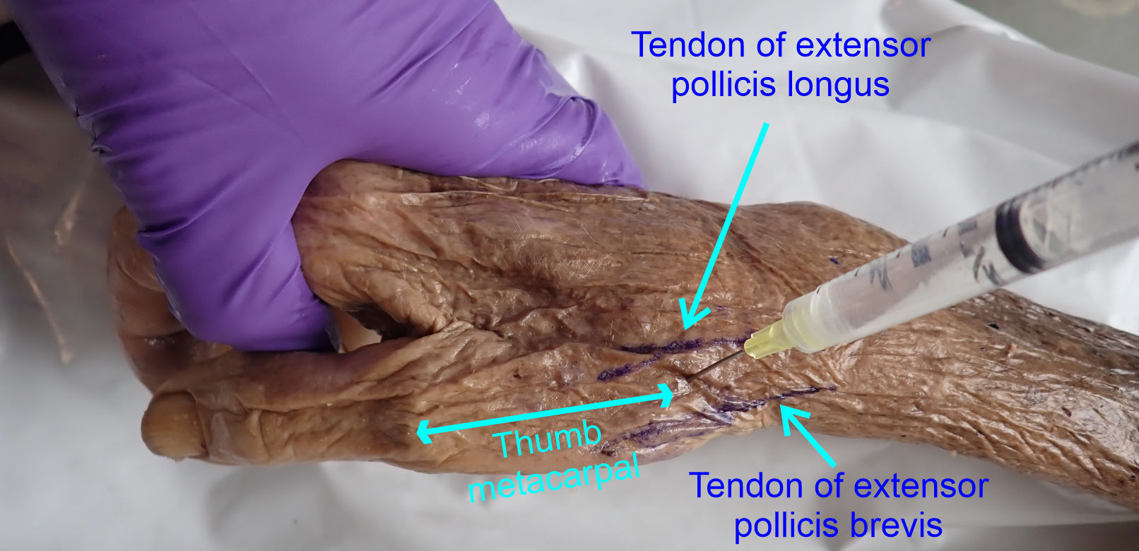 dorsal to the tendon of the extensor pollicis brevis and insert the needle aimed