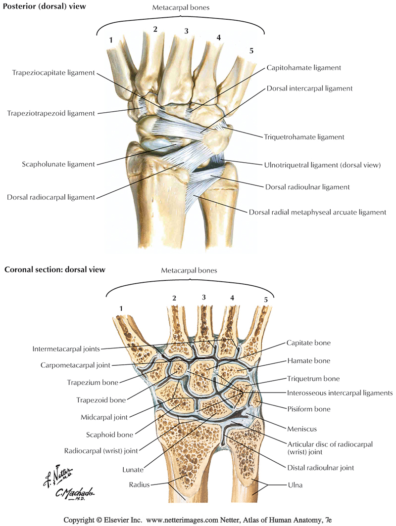 A complex of ligaments supports these joints, with one of the most important being the scapholunate (scaphoid to lunate bones). The scapholunate ligament is commonly injured in a Fall On Out Stretched Hands (FOOSH) or with degenerative tears in aging.