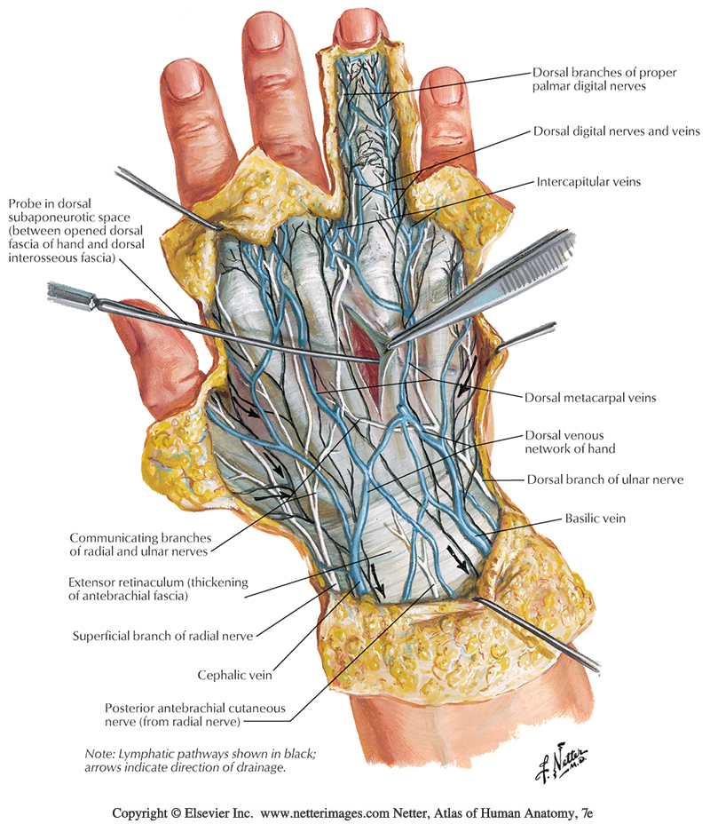 The superficial dorsal veins of the hand are a common target for blood collection or I.V. lines. The other common upper limb venous access location is the median cubital vein. Additionally, proximal venous access can be achieved through a central line into the subclavian vein.