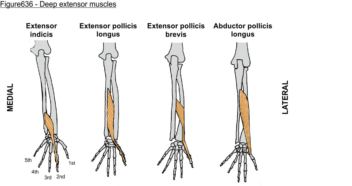The abductor pollicis longus and extensor pollicis brevis both 'wrap' across the tendons of the extensor carpi radialis brevis and longus. This arrangement can be very useful for identifying the muscles.