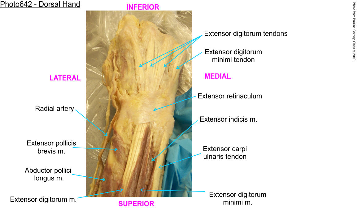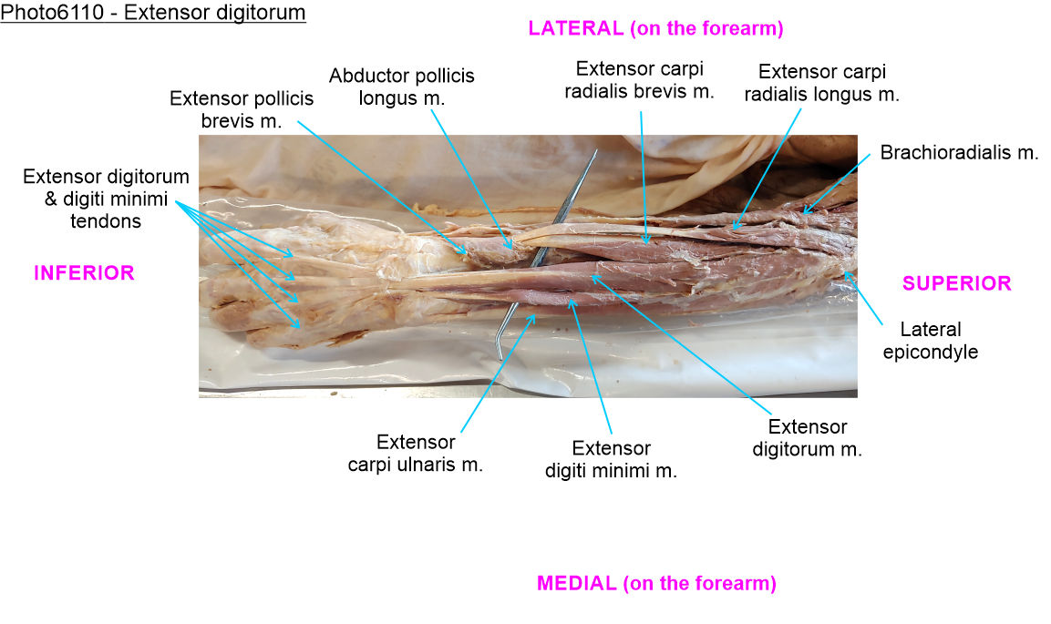 Distally, the muscle belly separates forming four tendons that arise from the muscle and travel into the wrist. Follow them just to the wrist as we will examine the dorsum of the hand later in the lab.