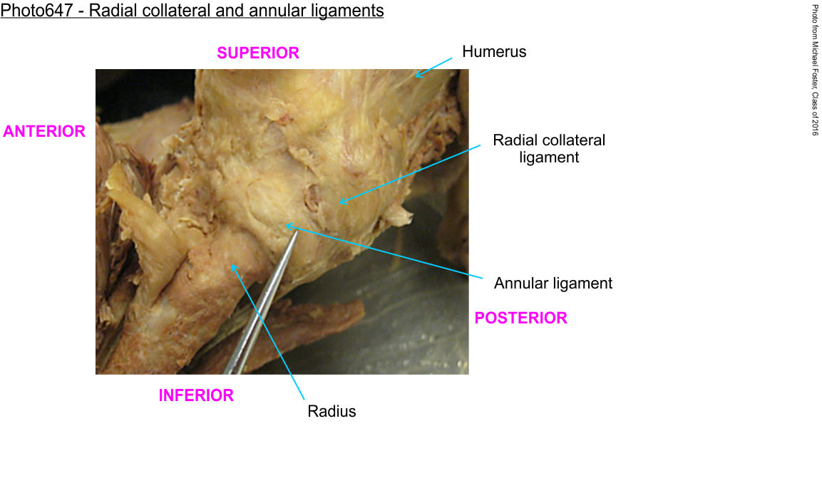 The head of the radius is covered by thin anterior capsule tissue (cut away here). The neck of the radius bone is wrapped by the thicker annular ligament.