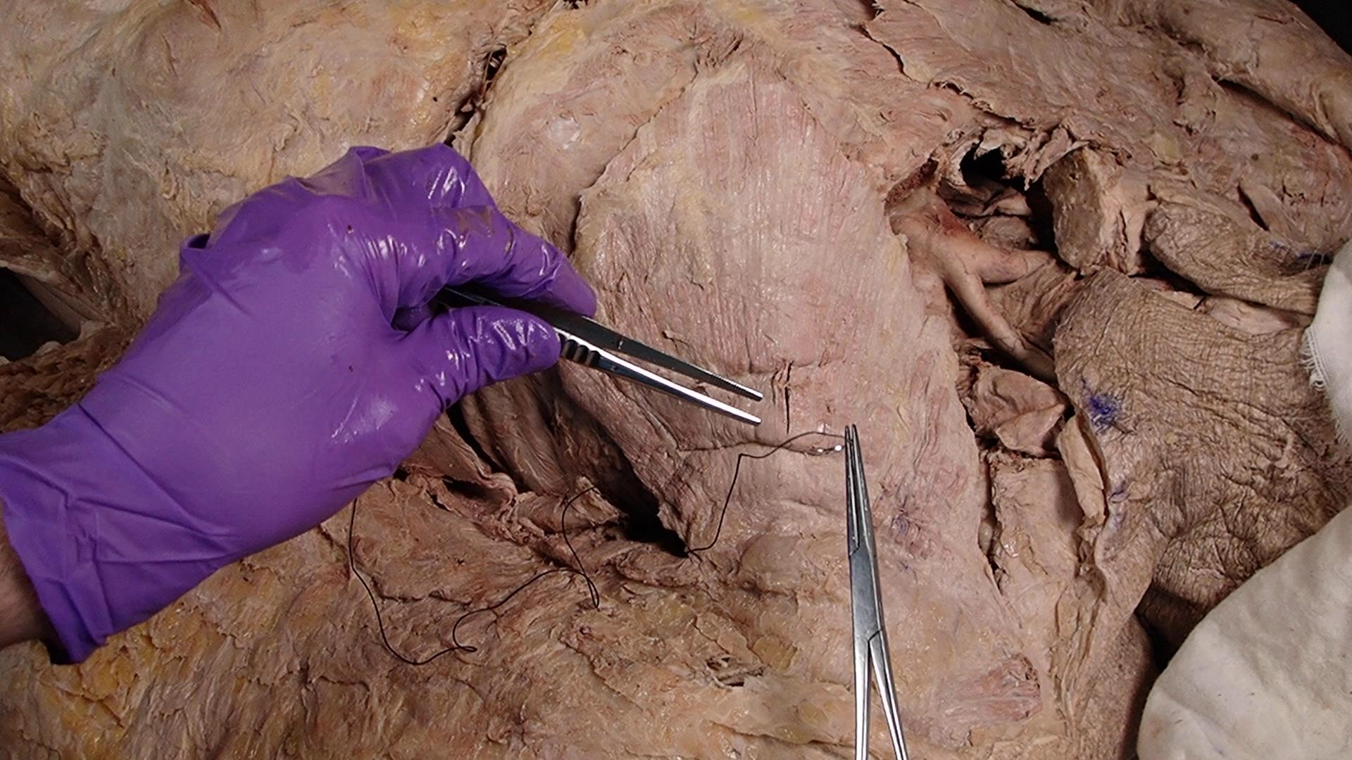 3) With the other hand use a pair of forceps, such that one arm of the forceps is on each side of the cut, and press the cut edges of the transected muscle or subcutaneous tissue into close proximity with the correct opposing edge.